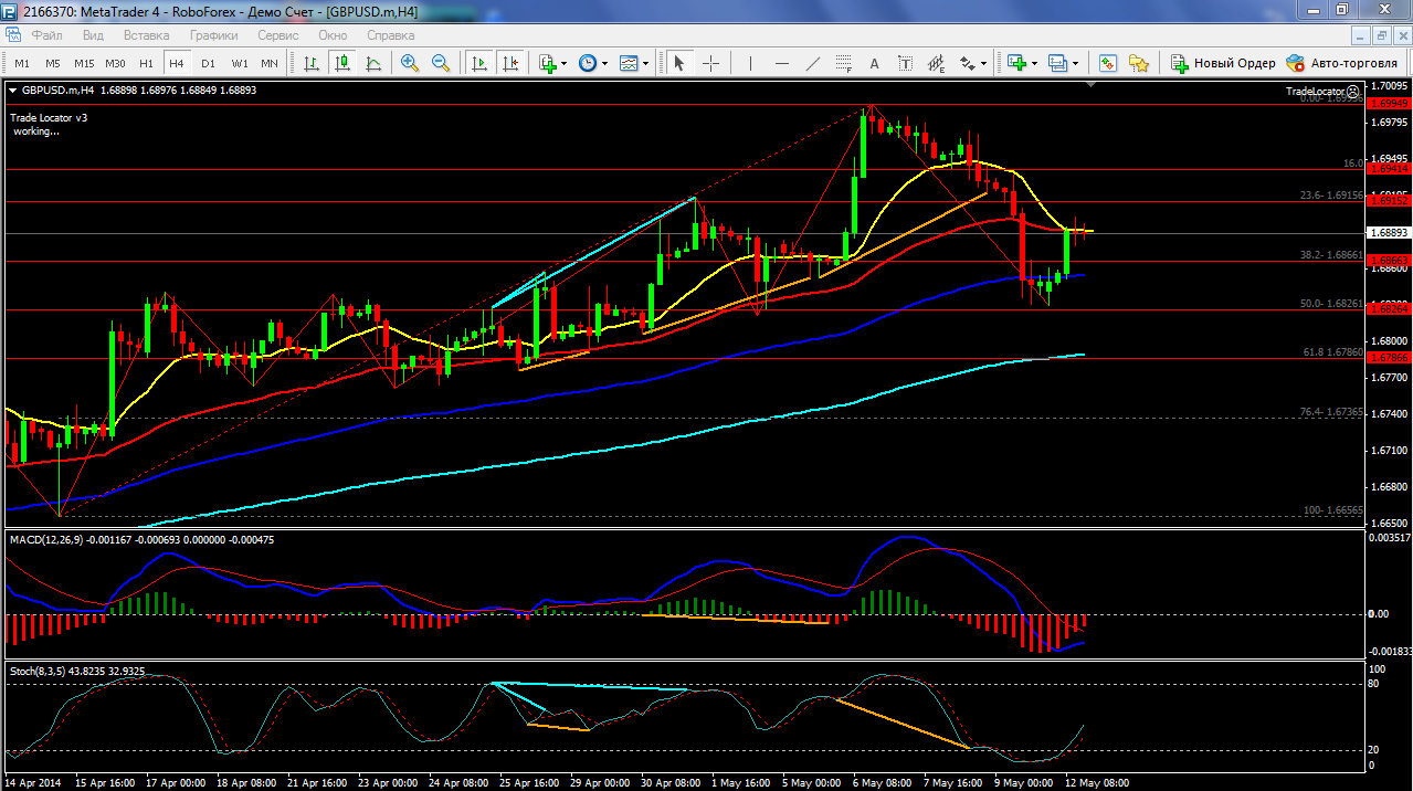 Пара GBPUSD H4 торгуется в восходящем канале и ниже скользящих средних с периодами (14,50,100,200). Индикатор MACD - находиться в отрицательной зоне и не подает четких сигналов. Индикатор стохастик - вышел из зоны перепродонности и подает сигнал на покупку. Северная цель -1.6915(фибо-23.6), -1.6941(фибо-16.0) и -1.6995 локальный максимум от 06.05.2014. Южные цели -1.6866(фибо-38.2), -1.6826(фибо-50.0) и 1.6786(фибо-61.8 и ЕМА-200). Прикрепленные файлы: