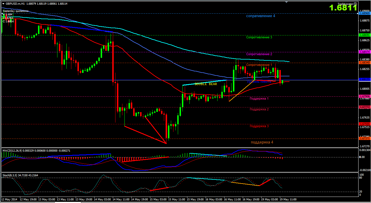 Пара GBPUSD H4 торгуется в низходящем канале и ниже скользящих средних с периодами (14,50,100). Индикатор MACD - находиться в отрицательной зоне и поддерживает продажи. Индикатор стохастик - находится между уровнями 20-80, но развернулся в направлении перепродонности и тем самым поддерживает продажи. Северная цель -1.6866(фибо-38.2), -1.6915(фибо-23.6), -1.6941(фибо-16.0) и -1.6995 локальный максимум от 06.05.2014. Южные цели - 1.6786(фибо-61.8 и ЕМА-200), -1.6736(фибо-76.4) и 1.6656(фибо-100). Прикрепленные файлы:
