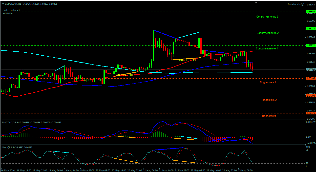 На данный момент по паре GBP\USD торговля ведется между ЕМА 50.24. дополнительный индикатор ниже нулевой линии с показанием на повышение а основной индикатор дает сигнал на покупку. судя по показаний на рынке торговлю ведут быки которые продвигают цену на север. по пути следования сильный уровень фрактала и закрепление цены выше этого уровня означает дальнейшее движение на север до уровня 1.6860. Прикрепленные файлы: