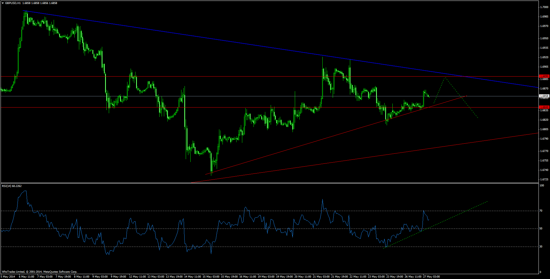 Пара фунт доллар США на часовике сохраняет восходящую тенденцию. RSI направлен вверх. Ожидаю повторный отскок от трендовой линии (в точке пересечения с уровнем 1.6840) и возобновление роста до 1.6890 Прикрепленные файлы: