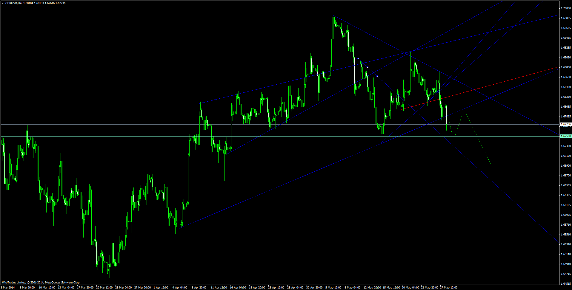 Валютная пара фунт доллар пробила синюю дневную трендовую линию, опустившись до уровня 1.6700. Как правило такие уровни с первого раза не пробиваются. Ожидаю возврата цены к пробитию и после отскока возобновление снижения к 1.6700 Прикрепленные файлы: