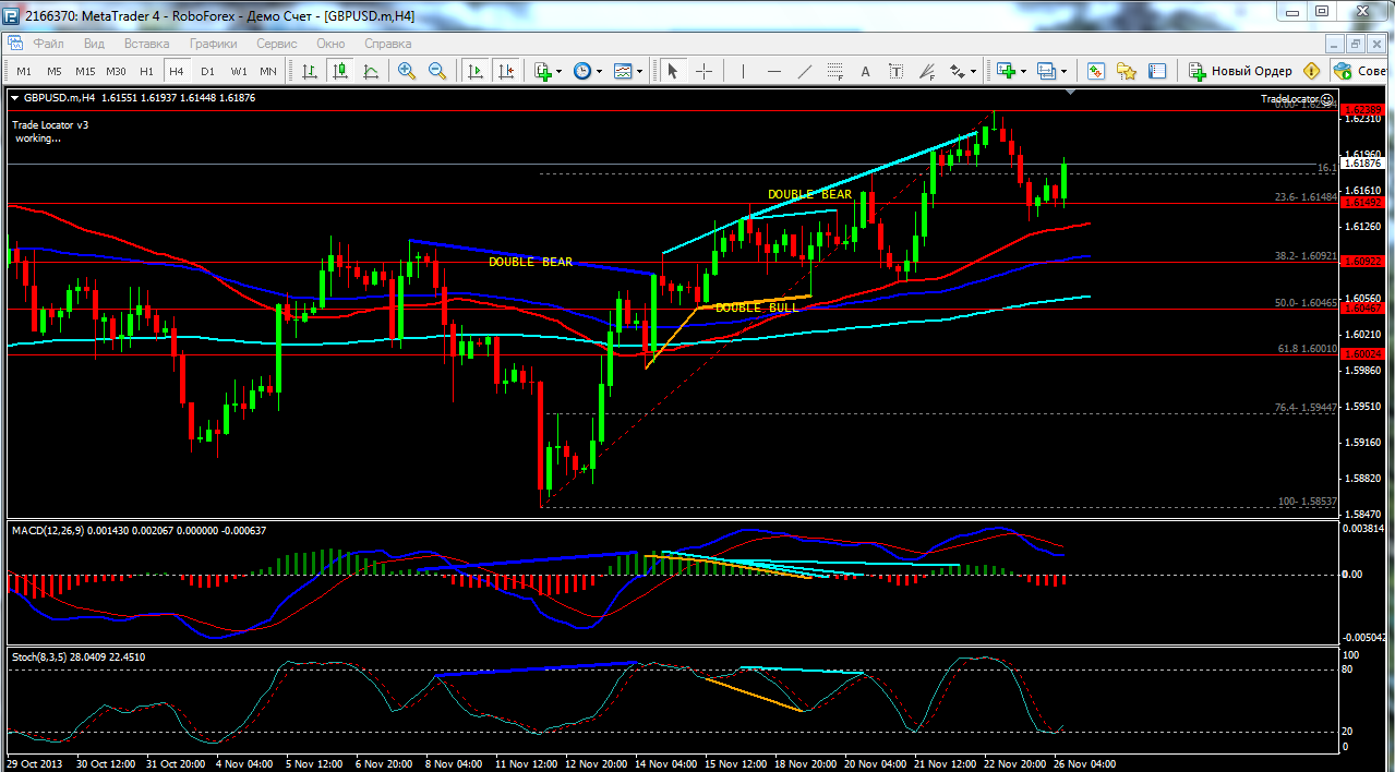 На Макд Н1 образовалась дивергенция. На графике Н4 Стохастик перекуплен и показывает тоже дивергенцию. Индикатор объемов Волиум показывает снижение объмов. Таким образом, все индикаторы показывают ПРОДАЖИ. Ближайший уровень сопротивления 1.6240, второй уровень 1,6140. ![]() :smile: