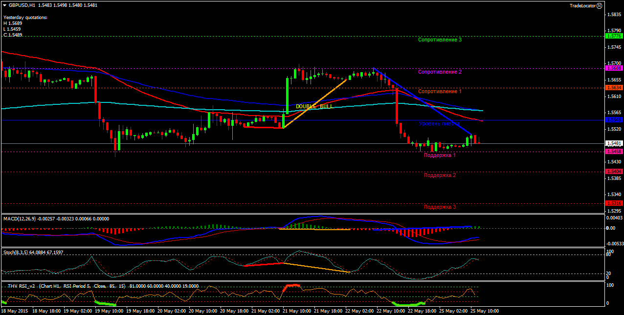 Пара GBP/USD H1. Индикатор MACD - находится в положительной зоне и подаёт сигнал на покупку. Индикатор стохастик -подходит к зоне перекупленности и поддерживает покупки. Индикатор RSI-так же поддерживает покупки. Северные цели: сопротивление-1(1.5686), сопротивление-2(1.5723), сопротивление-3(1.5789). Южные цели: поддержка-1(1.5522), поддержка-2(1.5474), поддержка-3(1.5442). Цена торгуется в восходящем канале,выше скользящих средних(ЕМА) с периодами (50,100,200).