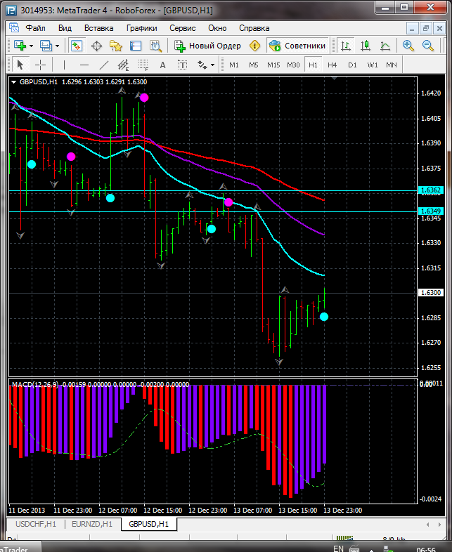 На сегодня по паре GBP\USD торговля ведется между ЕМА 100.50. дополнительный индикатор выше нулевой линии с показанием на повышение а основной индикатор дает сигнал на покупку. судя по показаний на рынке торговлю ведут быки которые продвигают цену на север. по пути следования сильный уровень фрактала и закрепление цены выше этого уровня означает движение на север до уровня 1.6358. Прикрепленные файлы: