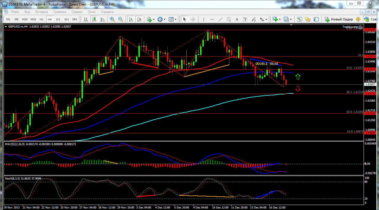 Пара GBPUSD H4 торгуется в восходящем канале канале и ниже скользящих средних с периодами (50,100) Индикатор MACD-находиться в отрицательной зоне и неподает четких сигналов.Индикатор стохастик-находится между уровнями 20-80 и так же не подает четких сигналов.Цена торгуется в коррекционном диапозоне,между скользящими средними ЕМА100 и 200. Южные цели-1.6231(фибо-38.2 и ЕМА200),-1.6159(фибо-50.9) и 1.6087(фибо-61.8). Северные цели -1.6320(фибо-23.6), -1.6367(фибо-16.1) и -1.6464 локальный максимум. Прикрепленные файлы: