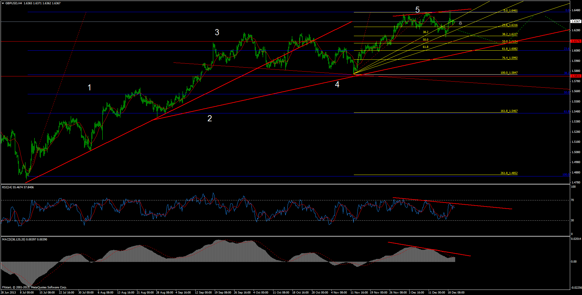 Пара фунт доллар красиво отбилась от 38 фибоуровня и долетела до 0-го. Однако выше не пошла, показывая нежелание дальнейшего роста. RSI скорее медвежий, чем бычий. Более того, на MACD и RSI наблюдается дивергенция, оба показывают на снижение. На фоне этого предполагаю начало снижения к первой цели 38-го фибоуровня - 1.6237 Прикрепленные файлы: