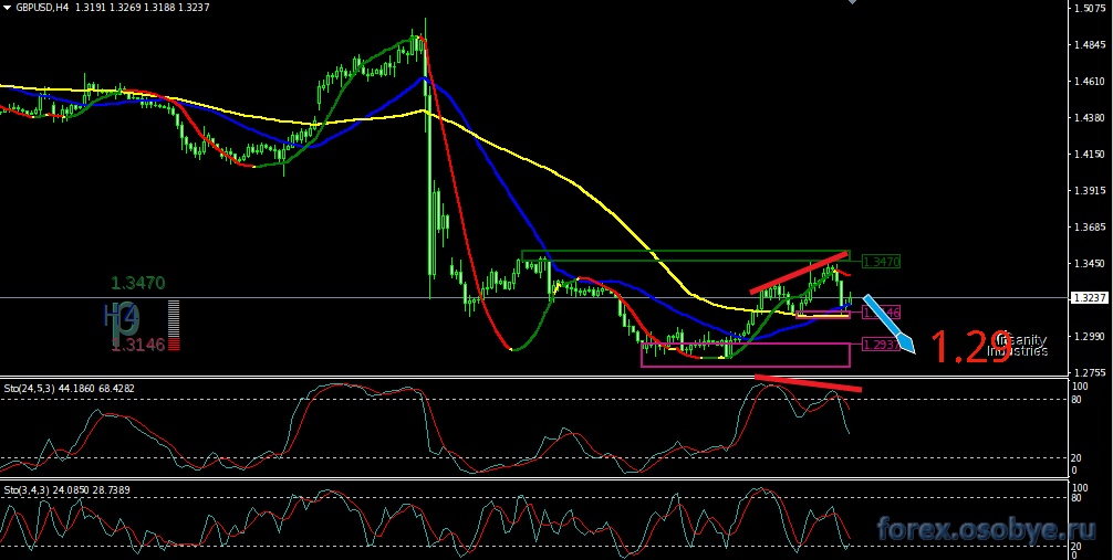 На фунте на четырех часах при общем понижательном движениии цены образовалась медвежья дивергенция при том, что цена отбилась от зоны сопротивления в районе 1,3470. Скорее всего цена достигнет зоны поддержки в районе 1,29, от которой очень вероятен отбой вверх.