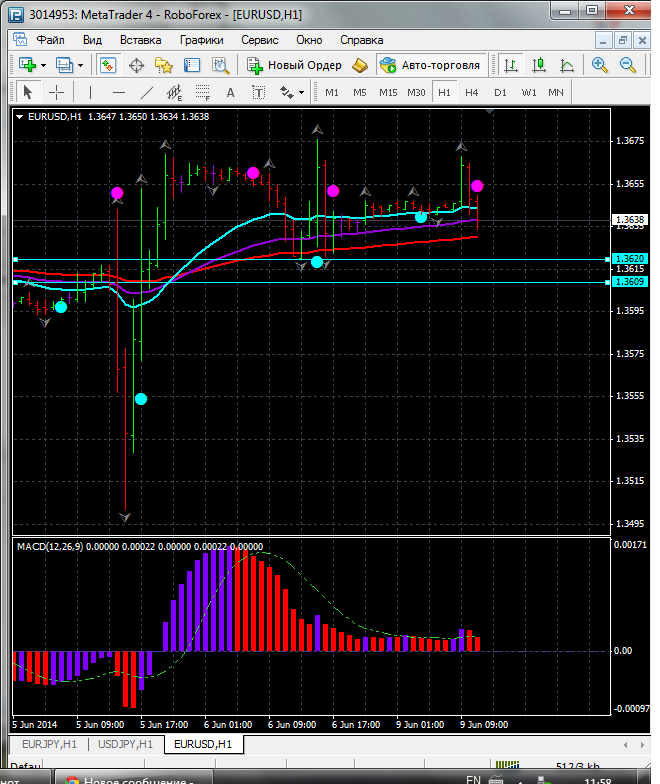 Исходя из того что по паре EUR\USD торговля ведется ниже ЕМА 100.50.24. дополнительный индикатор ниже нулевой линии с показанием на понижение а основной индикатор дает сигнал на продажу. судя по показаний на рынке торговлю ведут медведи которые продвигают цену на юг. по пути следования сильный уровень фрактала и закрепление цены ниже этого уровня означает дальнейшее движение на юг до уровня 1.3622. Прикрепленные файлы: