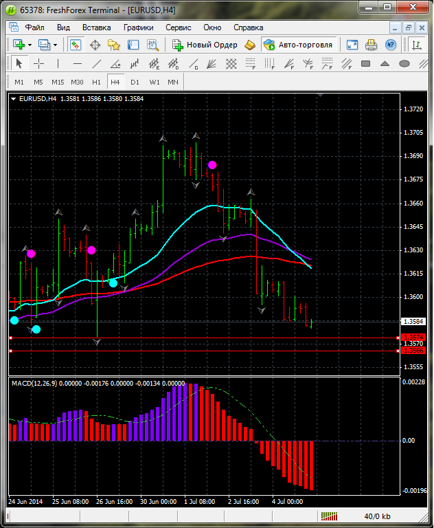 На данном тайфреме по паре EUR\USD торговля ведется ниже ЕМА 50.100.24. дополнительный индикатор ниже нулевой линии с показанием на понижение а основной индикатор дает сигнал на продажу. судя по показаний на рынке торговлю ведут медведи которые продвигают цену на юг. по пути следования сильный уровень фрактала и закрепление цены ниже этого уровня означает дальнейшее движение на юг до уровня 1.3566. Прикрепленные файлы: