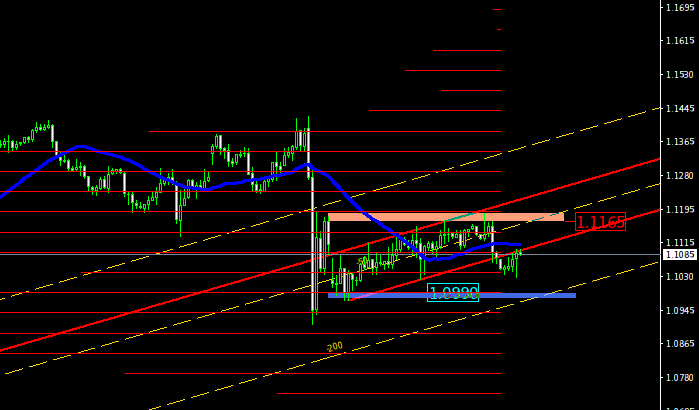 Сегодня пара подошла к линии сопротивления желтой и остановилась. Если цена отбивается от данной линии, ждем коррекцию на восходящее движение. Пробой красной линии поддержки подтвердит коррекцию и возможность ухода цены к 1.0911.