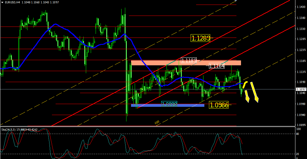 Сейчас валютная пара пробует пробить линию поддержки красную. И если ей это удается, то можно будет говорить о возможном продолжении нисходящего тренда к уровню 1.0911.