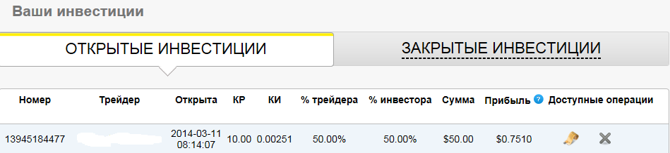 На самом деле идея мне нравиться. Но, повторюсь, хочется посмотреть как оно все на реале будет работать. Хочетс увидеть уже отчеты, а не просто "теорию". Уточните пожалуйста - что Вы конкретно хотите увидеть - работу управляющих, но ее можно проследить, зайдя в рейтинг MMIR счетов на сайте компании, или работу инвестиций? По инвестициям я могу дать информацию (см. скрин). Кстати! Эта моя инвестиция была в управляющего, который на момент инвестиции находился в нижней части таблицы рейтинга, то есть в просадке. Прикрепленные файлы: