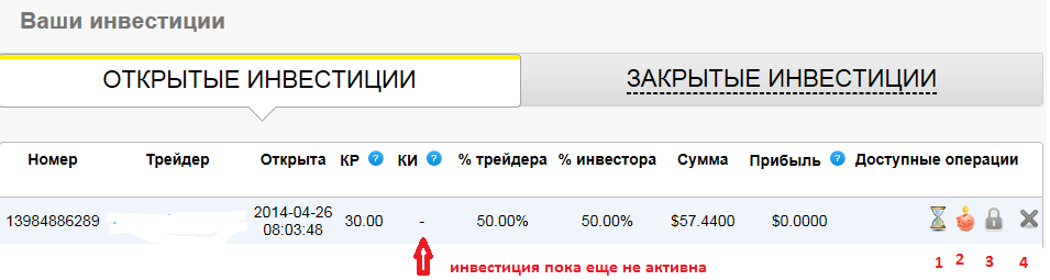 Произошли серьезные изменения в сервисе MMIR счета. В частности в ЛК инвестора появились опции "КАПИТАЛИЗАЦИЯ ПРИБЫЛИ" и "ОГРАНИЧЕНИЕ УБЫТКОВ". Давайте вместе разберемся - как это работает? Приведу пример (см. скрин) Немного напомню что "было" а потом что добавилось. Обратите внимание на то, что инвестиция прикреплена сегодня, а это нерабочее время, поэтому инвестиция пока еще неактивна и активизируется она только в конце первого часа с начала торгов новой рабочей недели. В момент активизации будет рассчитан и коэффициент инвестиции (КИ). Далее нам интересны красивые значки с номерами 1-4. 1. Песочные часы - это как раз и означает, что инвестиция еще неактивна и ждет времени прикрепления. Это так же означает, что инвестиция прикреплена к счету, где есть открытые сделки. Если бы сделок не было, то "часики" сменились бы на "свиток", кликнув на который можно видеть историю своей инвестиции (ну пока нет истории, только прикрепились). В этом случае сразу рассчитывается КИ. 2. Симпатичная Хрюшка-копилка - собственно это как раз опция "КАПИТАЛИЗАЦИЯ". Кликнув на нее инвестору будет предложено включить опцию капитализации, после чего вся ваша прибыль в расчетный период ТП будет реинвестирована. Если же опция не включается, то прибыль будет направляться на ваш инвест. счет. На скрине видно, что опция включена (красный цвет значка). 3. "Замок" - собственно опция ограничения убытков. Кликнув на значок появится табличка в которой вам будет предложено установить ограничение убытков по вашей инвестиции, при чем вы можете это установить либо в % либо в деньгах. В случае достижения установленной величины ваша инвестиция автоматически открепится от счета. Тем самым вы гарантированно можете проиграть не более того, чем установили сами! На скрине значок серого цвета, это означает что опция не включена и инвестора по сути устраивают 100% риски по своей инвестиции. 4. "Крест" - собственно кликнув на него вы мгновенно можете закрыть свою инвестицию. Еще раз обращаю внимание инвесторов - никаких "санкций" для инвестора в таком случае не предусмотрено. Вы сами хозяин своих денег и только вы решаете когда следует открепить инвестицию. Прикрепленные файлы: