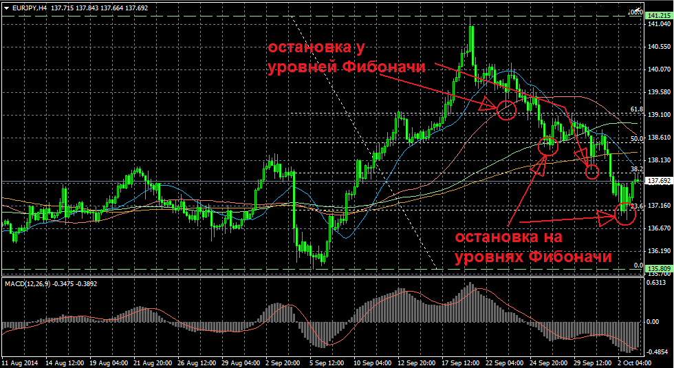 Вот как можно довольно правильно определить цели в торговле. Довольно точным показателем для определения целей являются уровни Фибоначи. Возьмём пример на вальтной паре евро-йена. Очень важно правильно установить уровни Фибоначи. Подчеркиваю --- важно правильно(!!!) установить уровни. И теперь смотрим на примере, смотрите рисунок: очень четко видно как цена валютной пары евро-йена останавливается у уровней или на уровнях. То есть, если однин уровень пробит, то следующая остановка будет на следующем уровне. Этот пример на 4-ьох часовом графике. Ну а если торговать на 15-и минутном графике или меньше, то можно получать неплохую прибыль, правильно определив цели. |