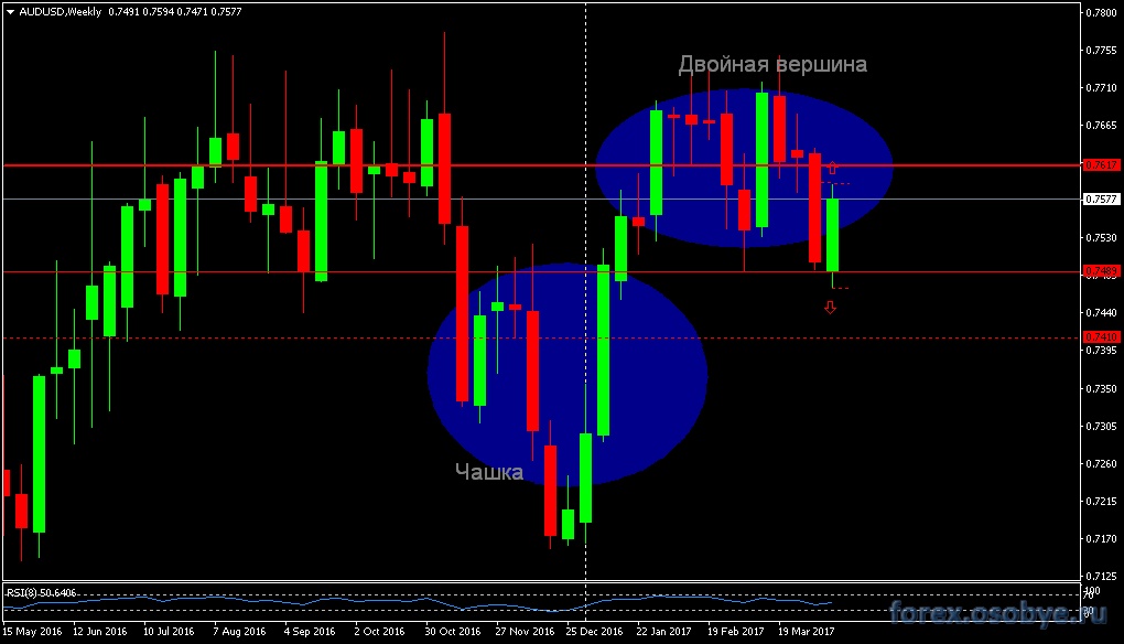 По валютной паре австралийский доллар-доллар США,в этом году, после завершения формирования и выхода наверх из чашки (которая начала формироваться с середины ноября прошлого года),в начале января,сопровождавшимся ростом примерно в три фигуры, цена с середины января находится в диапазоне 7489-7730 в виде графической фигуры-двойная вершина с уровнем формирования 7489. После пробоя вниз уровня формирования данной разворотной графической фигуры, цена развернулась и выросла в течении прошедшей недели, во внутрь диапазона (двойной вершины).В случае если цена на актив сможет закрепиться выше уровня сопротивления 7625(30) и середины диапазона,то не исключён рост пары к следующим уровням сопротивления 7650-7700(50), в противном случае, сползание цены под уровень поддержки 7550-определит первую цель снижения на уровнях-7500(7490). ![]() Редактировалось: 1 раз (Последний: 16 апреля 2017 в 03:15) | ||