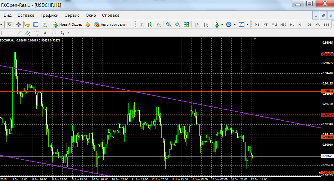 А на Н1 по доллару/ швейцарскому франку канал вниз. Люблю именно эту графическую фигуру сразу видно направление по паре. |