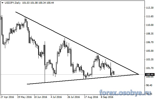 На дневном графике йены к доллару нарисовался четкий треугольник причем внутри его пять волн отработались ,значит скоро прорыв,треугольник симметричный - значит прорыв в любую сторону возможен.