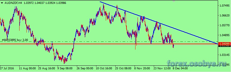 Пара AUD/NZD. На графике ТФ 4 часа. Цена пары там торгуется в углу, образованном трендовыми линиями поддержки и сопротивления. Сейчас цена в третий раз отрабатывает нижнюю сторону угла. Угол направлен вниз. Выход из него предположу, что будет наверх.