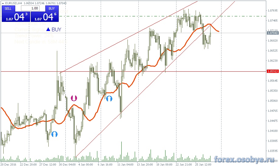Сейчас цена по валютной паре отбилась от линии сопротивления голубого канала и подошла к линии поддержки желтого клина. Если цена на н4 пробивает данную линию и закрепляется ниже нее нужно ждать разворот цены и снижение.