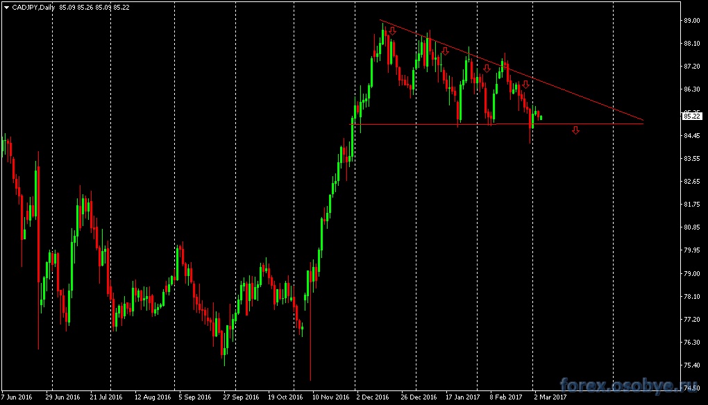 После хорошего роста в конце прошлого года, более десяти фигур,обусловленного в основном дешевеющей йеной,кросс-курс канадский доллар-японская йена, третий месяц к ряду демонстрирует консолидацию и неопределённость,в процессе которой, противоборствующие силы на рынке,в ходе своей борьбы, восстанавливают некоторый паритет и скорее всего, временное равновесие.Эти процессы отобразились на графике данного кросса ,формированием классической графической фигуры-нисходящий треугольник, говорящей о нарастающем давлением медведей и о возможности формирования нисходящего коррекционного движения. ![]() Редактировалось: 3 раз (Последний: 6 марта 2017 в 07:48) | ||