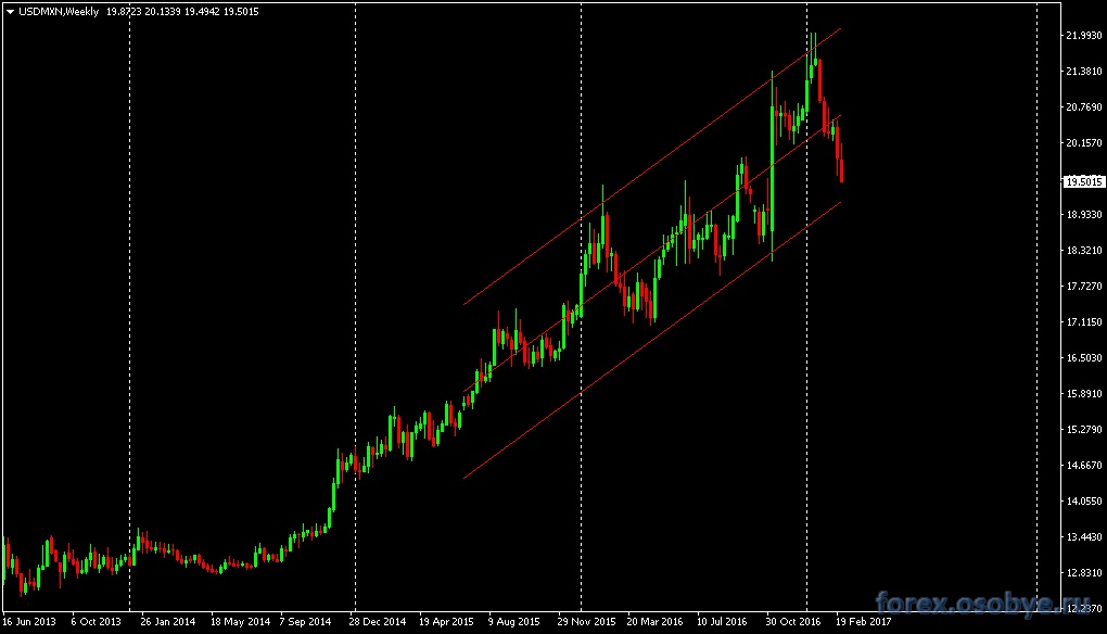 Валютная пара доллар- мексиканское песо,длительное время, демонстрирует восходящий тренд роста доллара.В прошлом 2016-ом году, движение пары проходило в восходящем канале,давая возможности трейдерам как для покупок в нём , так и для продаж. Сейчас цена приближается к нижней границе канала, который может оказаться и разворотным флагом, так что по паре не исключена коррекция , с формированием диапазона,границы которого пока не совсем ясны. ![]() Редактировалось: 1 раз (Последний: 7 марта 2017 в 19:19) | ||