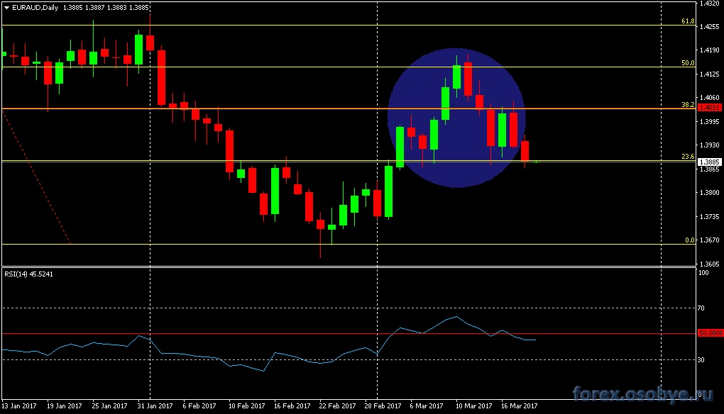 По кросс-курсу евро-австралийский доллар, сформировалась разворотная графическая фигура голова-плечи, с уровнем формирования 1.3881, что совпадает с 23.6% Фибоначчи.То что, данная фигура сформировалась не на вершине рынка, после восходящего тренда, а в диапазоновом нисходящем движении, несколько снижает её силу и остроту,но предпочтения, ИМХО,продажам. ![]() | ||||
