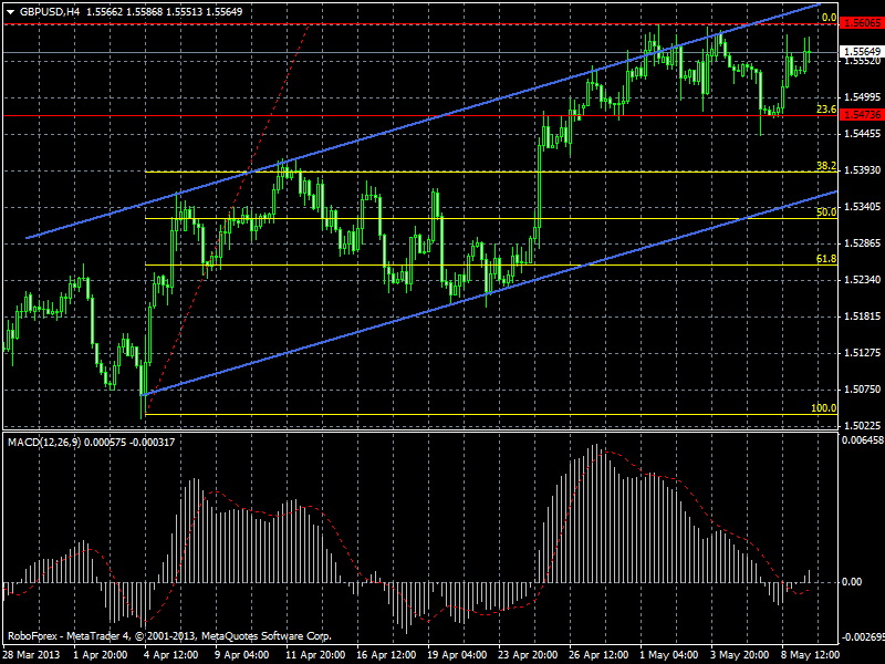 Валютная пара движется в рамках восходящего канала на 4-х часовом графике, на данный момент цена стремится к уровню сопротивления канала 1,5615, откуда планирую продавать валютную пару с первой целью на уровне 1,5473, что соответствует уровню 23,6% по Фибоначчи. Прикрепленные файлы: