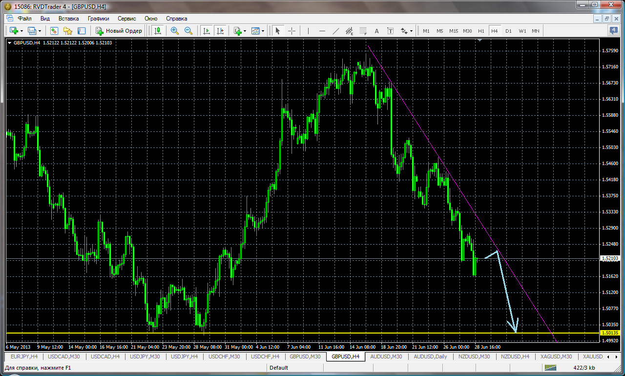 ![]() Курс на данный момент находится в нижней части канала Боллинджера, и, как можно заметить, понижение идет уже довольно долго. Пока что рынок не дает оснований полагать, что в ближайшее время тенденция изменится. Пока рекомендую рассматривать продажи до уровня 1.51 и продавать до каких либо сигналов по MA и MACD. Редактировалось: 1 раз (Последний: 28 июня 2013 в 19:20) | ||||
