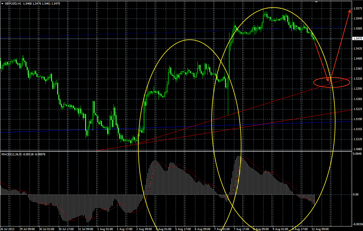 В настоящее время ожидаю снижение пары в район 1,53 - 1,5330, для теста трендовой. Более чем уверен что от нее последует отскок с ближайшей целью хая прошлой недели, а затем вероятно и дальше на север. Если посмотреть две последние волны подъема, то можно увидеть что они очень похожи как по свечному графику, так и по MACD. |
