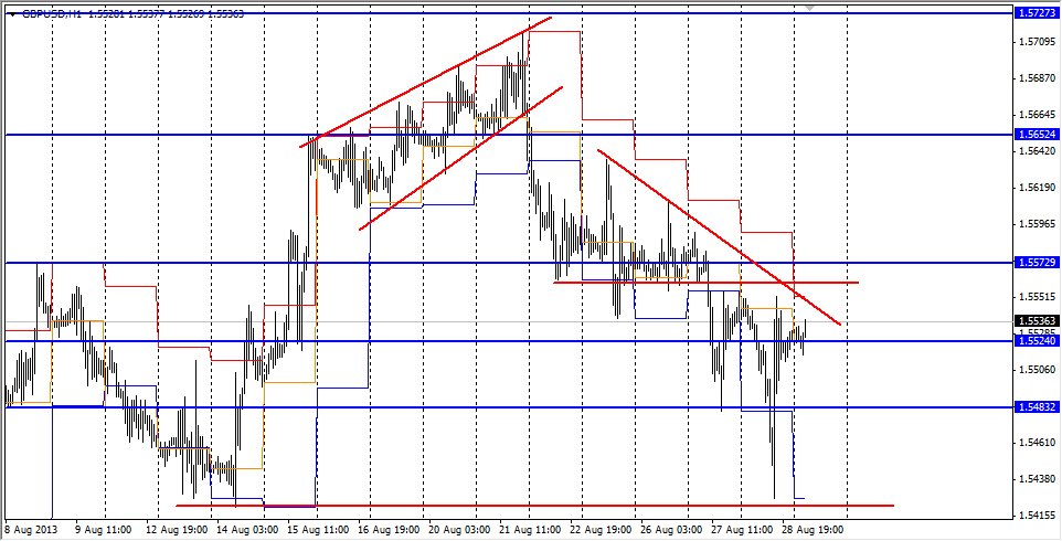 ![]() Пара находится во флете после недавней отработки третей точки от поддержки. На D1 28-08-2013 образовалась свечная модель молот. Которая есть предпосылкой к тому, что скорее всего фунт будет рости дальше. Цель 1,6150 - сопротивление нисходящего кана на W1. сечас на пару оказівает давление мувинг 75 на H1. После пробития его вверх, буду рассматривать покупки. | ||||