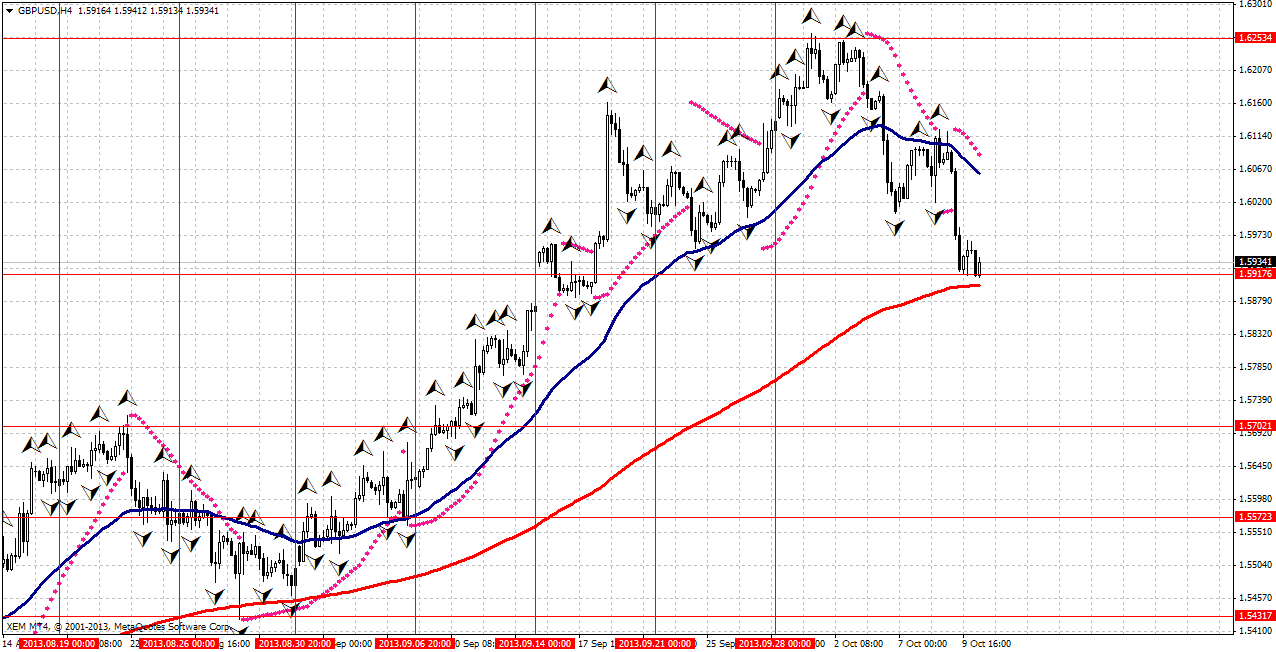 Пара пробила максимум предыдущего дня и торгуется выше уровня скользящей средней 55.Скользящая средняя 21 направленна вверх,индикатор выше нулевой отметки с повышающей тенденцией.Рассматриваю эти данные как продолжение тренда на север к уровню фибо 23,6 с открытием ордера при коррекции у уровня фибо 38,2 на 1,5977.Стоп лосс на уровне поддержки на 1,5961.