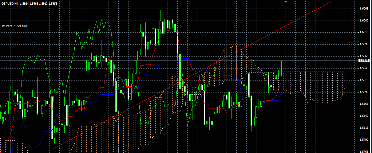 Пара поползла вверх. Если движение продолжится то планирую продавать с 1.6025 и выше к уровню Senkou Span B на четырехчасовом. Затем вполне возможно обновление хая на 1,6165, хотя больше склоняюсь к движению вниз на 1,5635 Прикрепленные файлы: