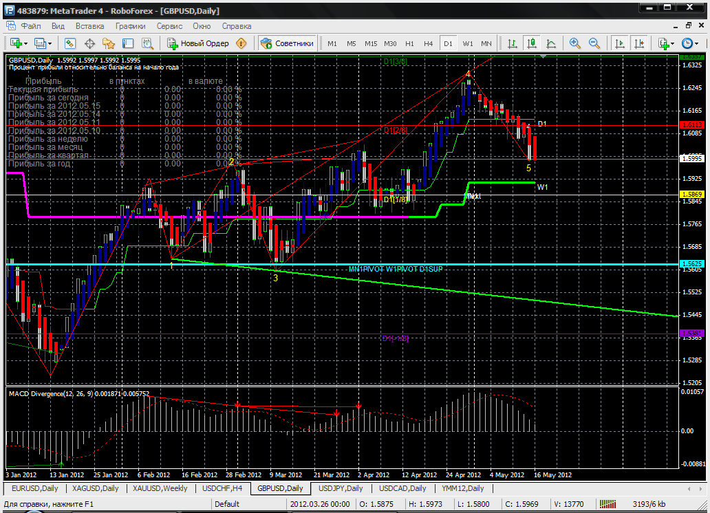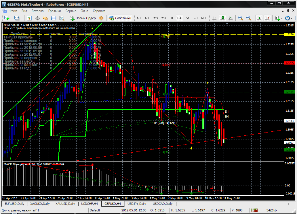 по данной паре ожидаю дальнейшее понижение . в случае пробоя уровня - 1,6052 h4 (3/8). следующий уровень по d1 - 1,5914- линия супертренда. индикатор macd находится в отрицательной зоне. Прикрепленные файлы: