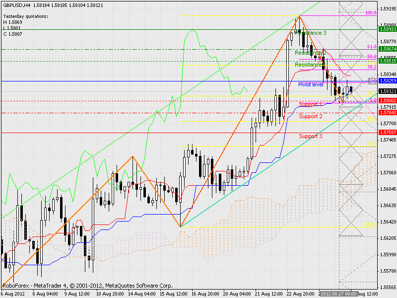 Сегодня пара торгуется практически без особых изменений, курс отстаивается около 5800 фигуры, (также там проходит и нижняя граница облака ишимоку) я думаю что все таки будет рост на север (и отбой от 5800). ![]() | ||||