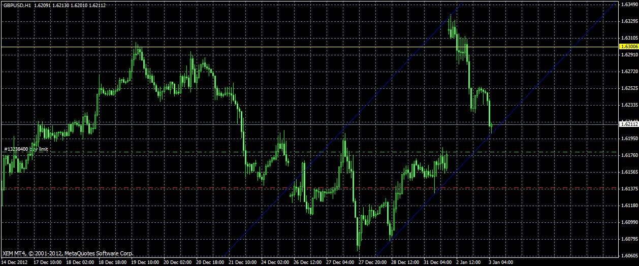 При достижении трендовой линии сработал отложенный ордер на открытие длинной позиции со стопом чуть ниже локальной трендовой линии. Цена уже несколько раз подряд тестировала данный уровень и пробить его не удавалось и в этот раз я считаю,что уровень должен устоять и пара взяла курс на 1.6300.