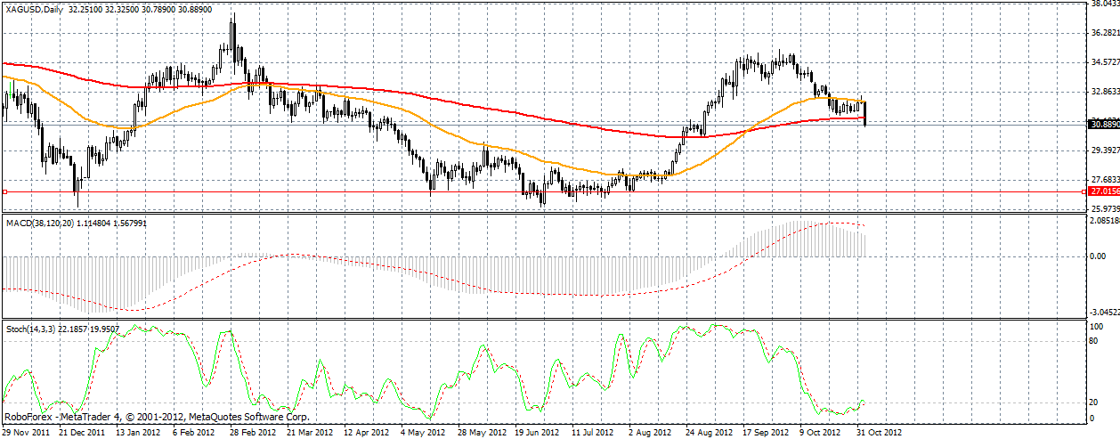 Серебро все же не пустили выше синей скользящей аллигатора, цена опять отбилась от него (сопротивления 32.15) и сейчас продолжает падать, пока для сильного снижения еще нужно прорвать поддержку 31.55, но думаю и она не устоит под напором медведей. |