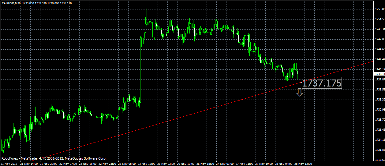 Нахождение золота возле трендовой линии создают опасную ситуацию по её пробою.Пробой данной линии повлияет на снижение с целевыми значениями отм. 1705.54-1675. На мой взгляд отбой от трендовой линии будет являться более предпочтительным вариантом развития ситуации,чем его пробой. |