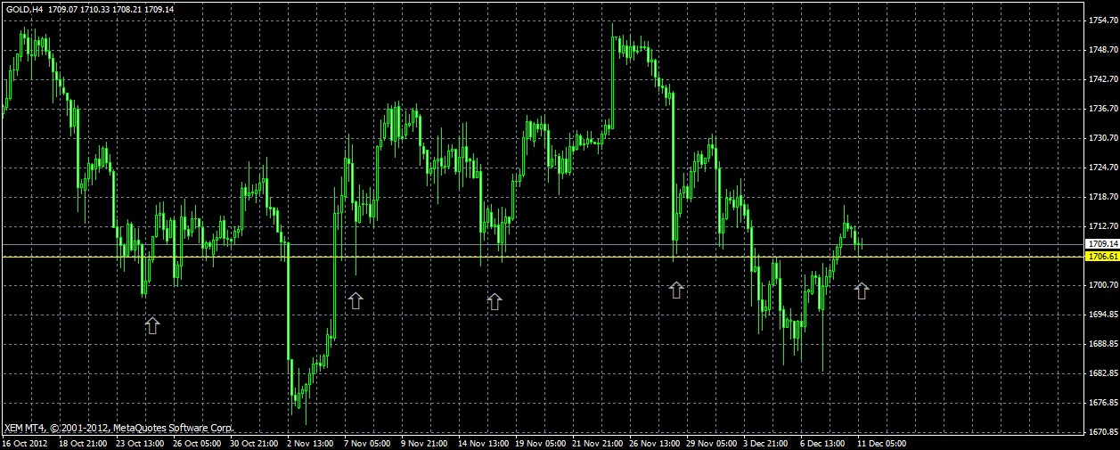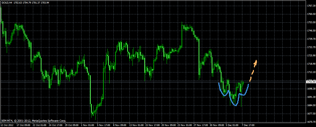 По золоту настало время делать покупки, цена на своей коррекционной волне нашла своего покупателя в районе зеленой скользящей (поддержка 1707) около которой сейчас происходит консолидация,стохастик также загибается на север, также на часовом графике произошло формирование 2 нижних фракталов (на юг цена идти не хочет). ![]() | ||||