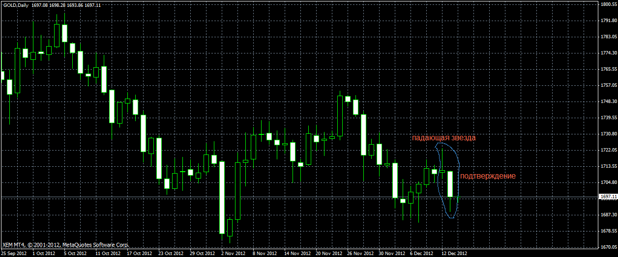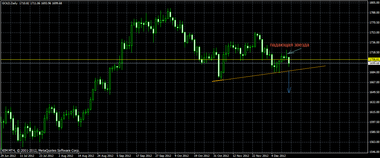 При всеобщем росте валютных пар ,золото продемонстрировала понизительную тенденцию,что ввергла меня в полное непонимание того,что произошло.Свечная разворотная формация "падающая звезда" вызвала такое снижение на дневном таймфере,но ведь она образовалась в середине движения и не может трактоваться как классическая разворотная модель.Какой нибудь скрытый инсайд,о котором мы узнаем вскоре не знаю, но мой хороший плюс превратился в плохой минус |