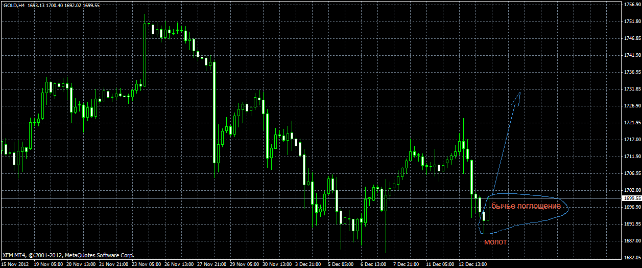 Внимательно отслеживаю ситуацию на 4-х часовом таймфере по золоту.Свечной патерн ."Молот" в составе "бычьего поглощения"(если,конечно, последняя свечка закроется большой бычьей свечей целиком поглотившая тело "молота")) даст сильный разворотный сигнал для быков. |