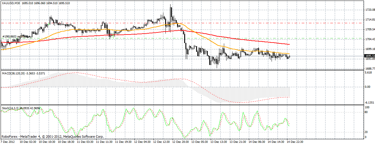 Золото:пока уровень 1702.5 выступает сопротивлением,возможно продолжение снижения цены актива.
