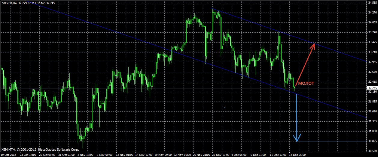 Серебро торгуется в нисходящем ценовом канале образовав в пятницу разворотную свечку "молот" без подтверждения.Пока не будет подтверждения говорить о реальном сигнале разворота пока рано.