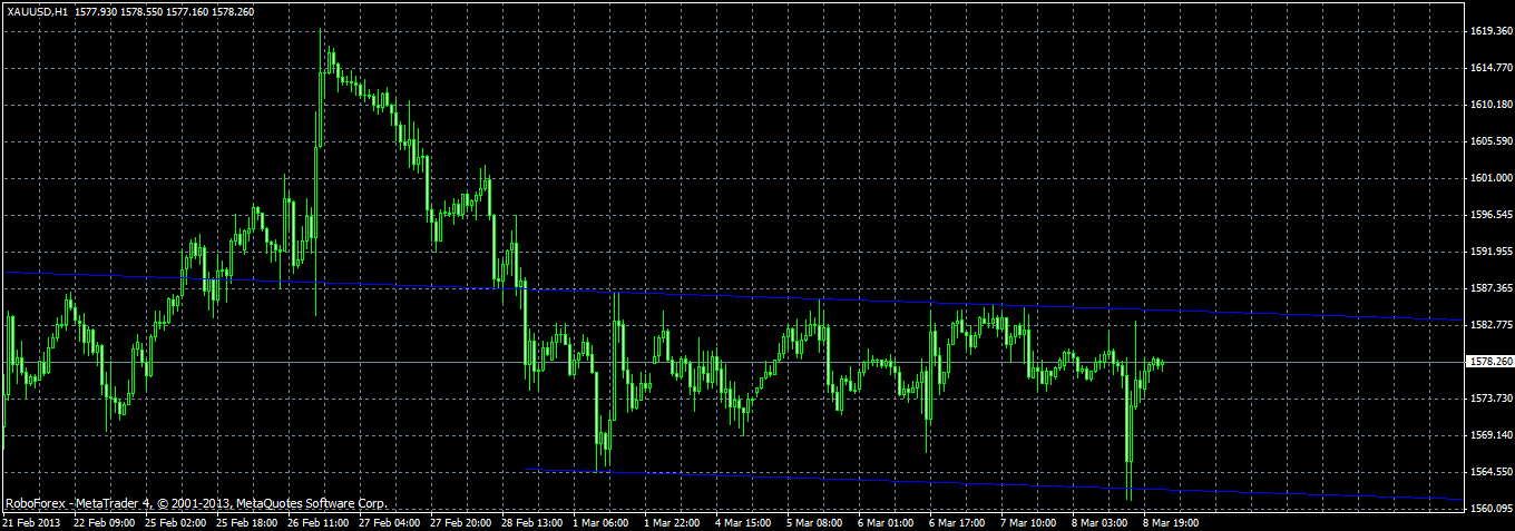 В моём прогнозе по Gold на следующую неделю с 11.03.2013 по 15.03.2013 исходя из технического и фундаментально анализа. Золото продолжает торговаться во флете. Фактически ни как не меняется цена на при выходе рыночных новостей. Такое долгое нахождения золота во флете как правило,рассматривается на продолжение снижения,но всё же остаётся развитие ещё одной структуры роста к уровню 1583.06 и если золоту удаться пробить и закрепится выше то движение последует к 1590.03 а за тем рассматриваю уже нисходящее движение к ценовому уровню на перекрытие 1561.03 ![]() | ||||