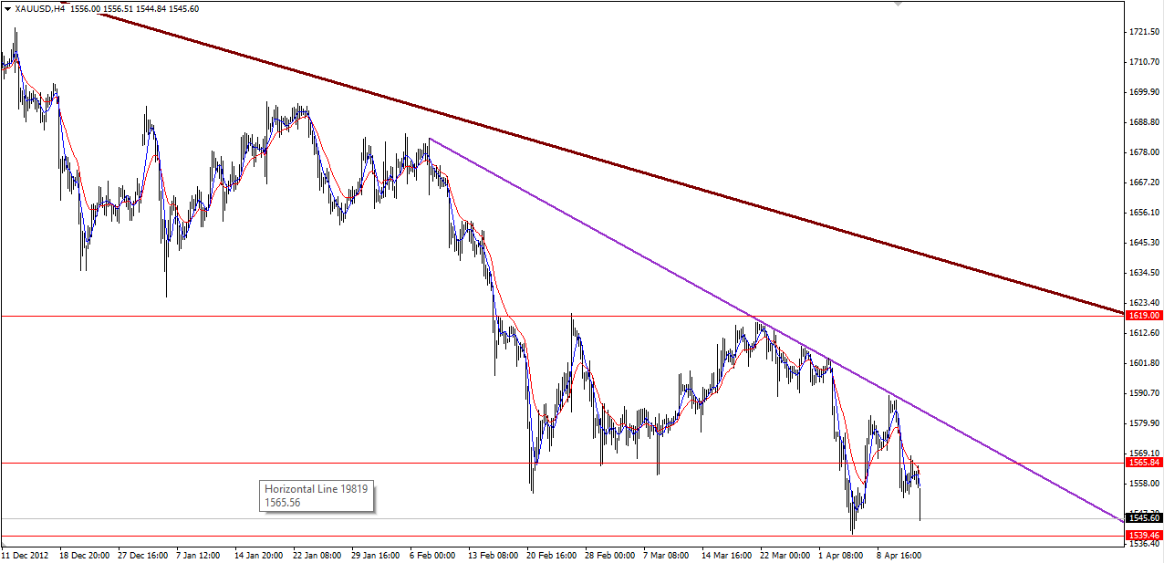 Цена золота пробивает сильнейший уровень поддержки сверху вниз. Данный уровень поддержки (1533.00-1530.00) имеет большое значение, так как четырежды цена находила на данной ценовой отметке сильную поддержку в прошлом.