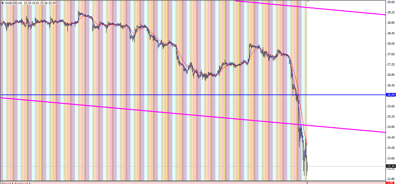 Проколов трендовую линию на часовом графике серебро обратно вернулось выше неё,сводя с ума своей непредсказуемостью.На пробое я открыл шорт,но ретест её напугал меня и я решил закрыть сделку ручками не дожидаясь стопа( Не суетись под клиентом!,- гласит первое правило в публичном доме г.Одессы) и дальше последовало то,что последовало.....