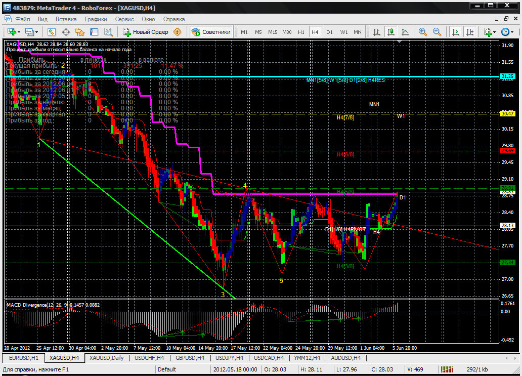 серебро - ситуация аналогичная , в случае пробоя лини супертренда и уровня - 28,91. h4 (5/8). возможен дальнейший рост с последующим уровнем - 30,47 Прикрепленные файлы: