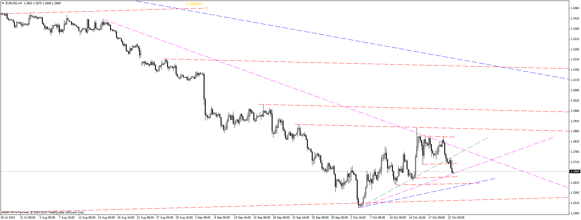 как видно на графике золото цена отбился от угла 1x1(идущий с вершины) и после пробила угол 1/4(фиолетовая линия, идущий с минимума) и сейчас идет к следующему углу 1/8(красная линия) ценовой диапазон 1211-1213 Прикрепленные файлы: