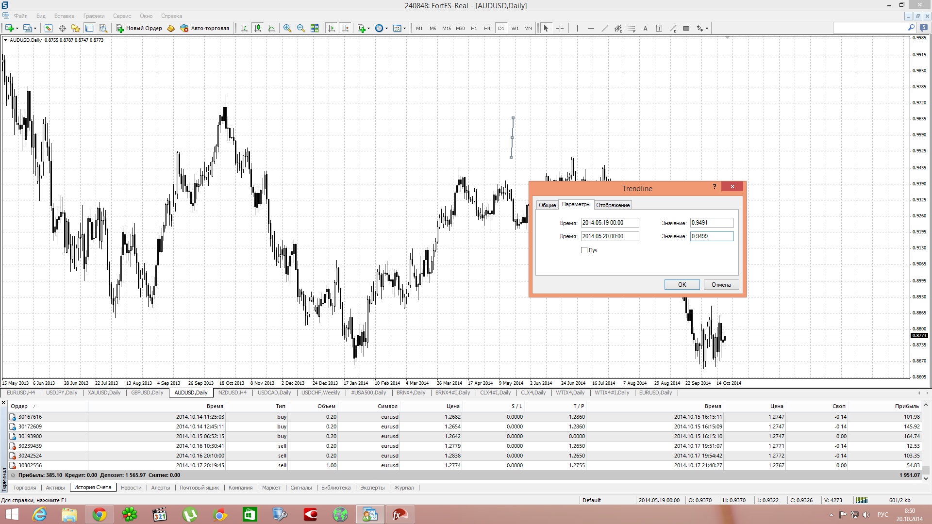 Что такое углы ? Ганн говорил что угол делит время и цену на пропорциональные части, то есть за одну единицу времени цена проходит такое же единицу, если берем угол 1x1 то цена за 1 день проходит 1 пункт или цент, 10 пунктов, смотря какая у данной пары шкала. Шкала это самое важное для построения углов.за все время изучение углов я нашел много способов для расчета шкалы, но самое простое и эффективное это метод проб, начиная с простых чисел и кратным им - 1,2,3 или 2,4,8. Очень много встречал когда угол 1x1 это угол 45 градусов, это подходит угла построенным шкалой 8, если посмотреть на валютных парах, то шкала 8 работает на многих из них.В мт4 есть инструмент углы Ганна, но при изменении таймфрейма инструмент перерисовывается, поэтому я строю углы с помощью трендовой линии-берем трендовую линию, заходим в параметре(на дневном графике, правой кнопкой-свойства) там видим 2 вкладки время, на первой ни чего не меняем а на втором меняем дату на +1 , с право есть 2 вкладки значение-первое не трогаем, а на втором прибавляем величину шкали. Ганн оставил нам 11 углов(смотри скрин), после построения угла 1x1 таким же образом строим и другие угли, 2x1- шкалу увеличиваем на 2, 1x2 -шкалу делим на 2.