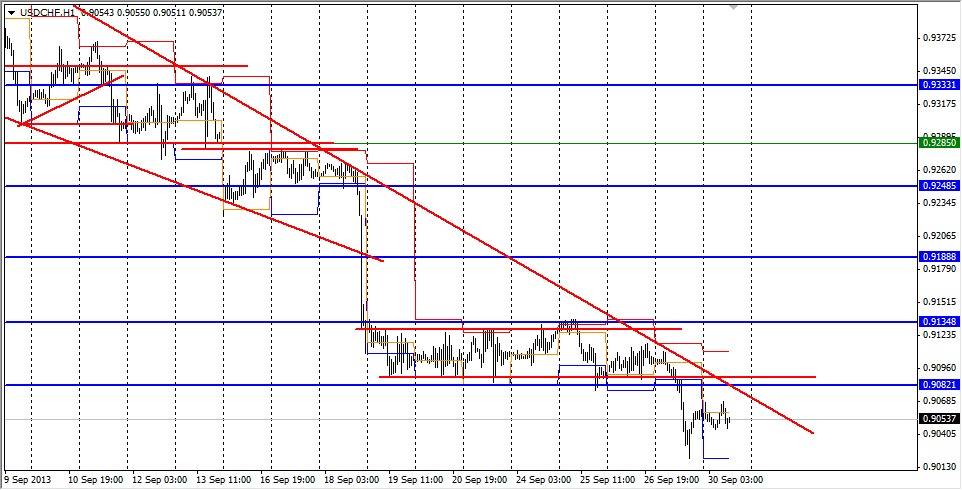Техника на 30.09.13. По паре USD/CHF - на D1 сформировалась фигура "Перевёрнутый флаг". Как видно из рисунка цена пробила нижнюю границу фигуры, сформировав сигнал на продажу. Открывать ордер планирую на ретесте минимума последней свечи - 0.9021. Прикрепленные файлы: