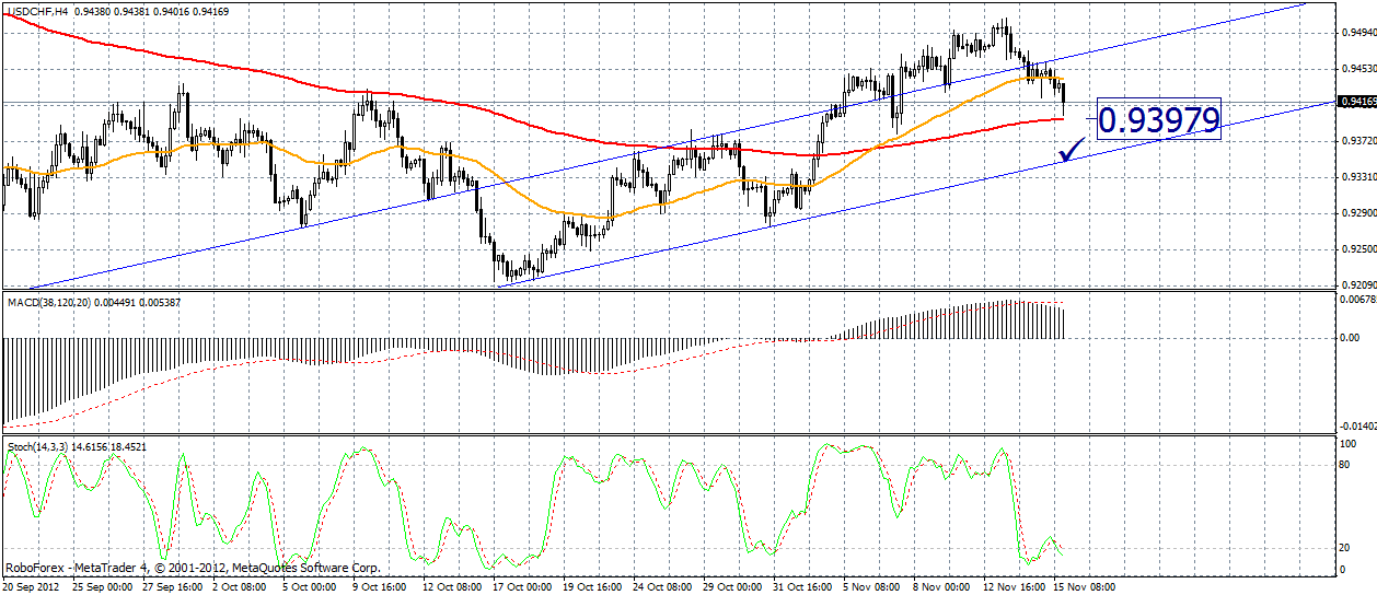 Котировки продолжают снижаться на валютной паре. Цель 0,9380 пока не достигнута. По индикатору макд присутствует сигнал на покупку.